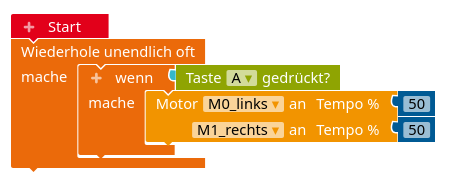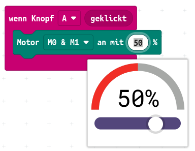 In der Kategorie "Motoren" gibt es dazu den Block "Motor ... an mit ...%", der es erlaubt, die Leistung der Motoren einzustellen: