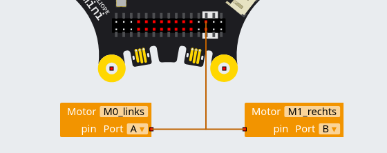 Zunächst müssen die Motoren konfiguriert werden. Dabei werden die Anschlüsse von Motor M0 als Port A bezeichnet und diejenigen von Motor M1 als Port B. Es ist sinnvoll, die Benennung der Motoren so vorzunehmen, dass man gleich sieht, welcher Motor links und welcher rechts am Roboter angebracht ist.