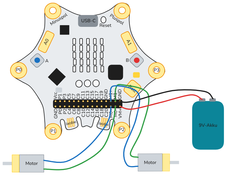 1. Schließe die Motoren an der Pin-Leiste des Calliope an. Dazu müssen die Kabel des einen Motors mit den Pins M0- und M0+ verbunden werden. Die Kabel des anderen Motors werden mit M1- und M1+ verbunden.